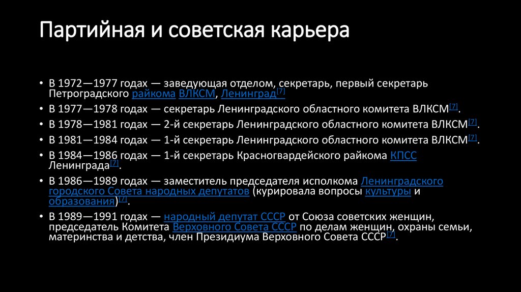 Партийная и советская карьера• В 1972—1977 годах — заведующая отделом, секретарь, первый секретарь