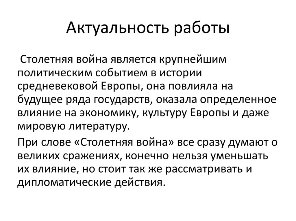 Актуальность работыСтолетняя война является крупнейшим