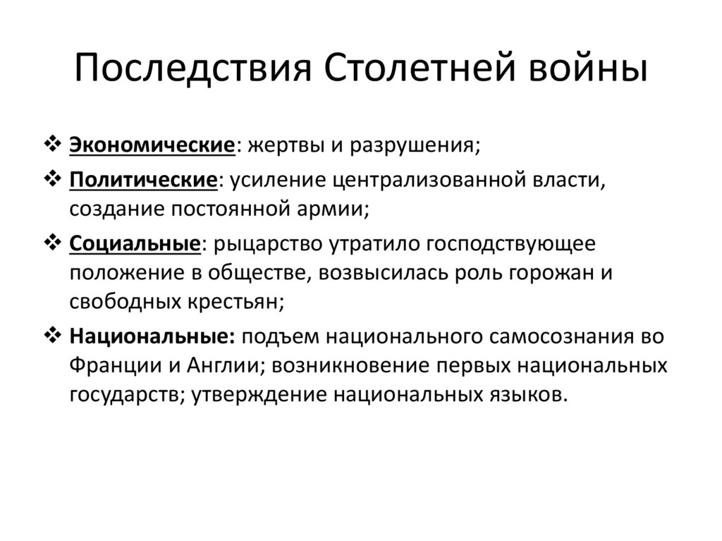 Последствия Столетней войныЭкономические: жертвы и разрушения;