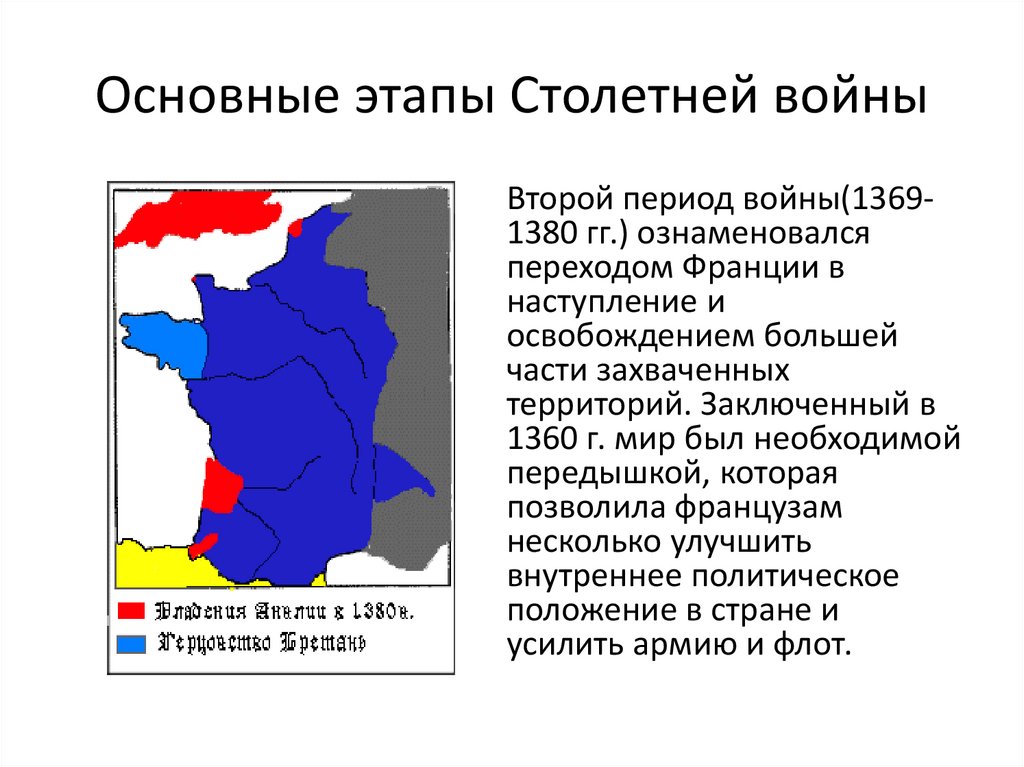 Основные этапы Столетней войныВторой период войны(13691380 гг.) ознаменовался