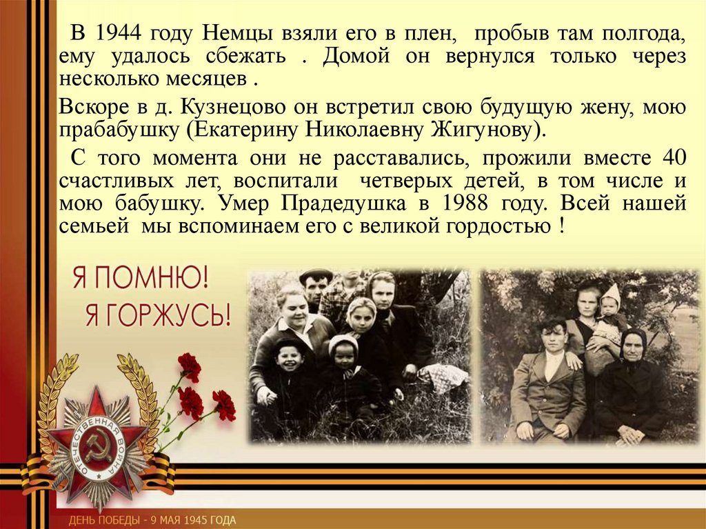 В 1944 году Немцы взяли его в плен, пробыв там полгода,ему удалось сбежать . Домой он вернулся только через