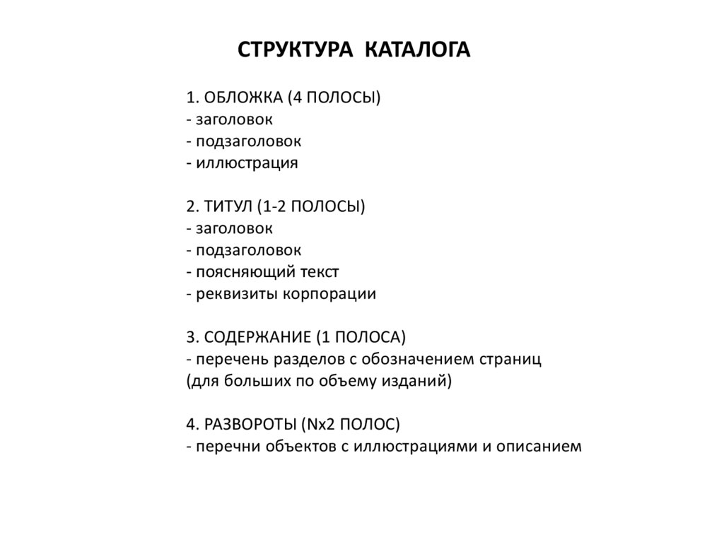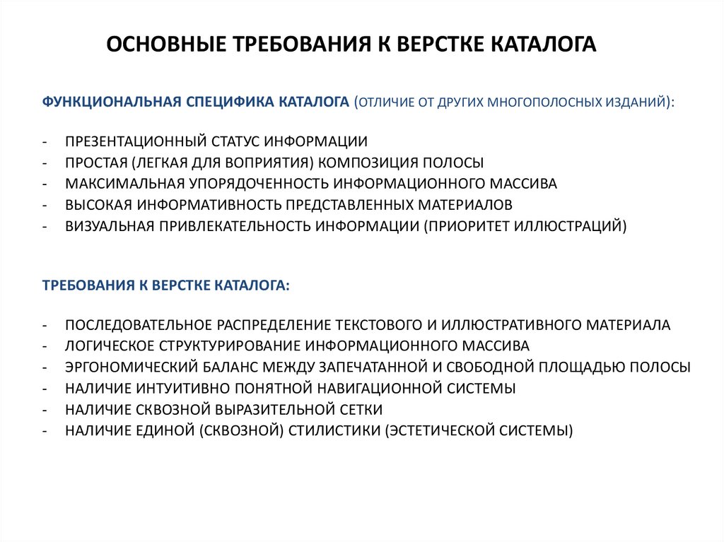 ОСНОВНЫЕ ТРЕБОВАНИЯ К ВЕРСТКЕ КАТАЛОГАФУНКЦИОНАЛЬНАЯ СПЕЦИФИКА КАТАЛОГА (ОТЛИЧИЕ ОТ ДРУГИХ МНОГОПОЛОСНЫХ ИЗДАНИЙ):