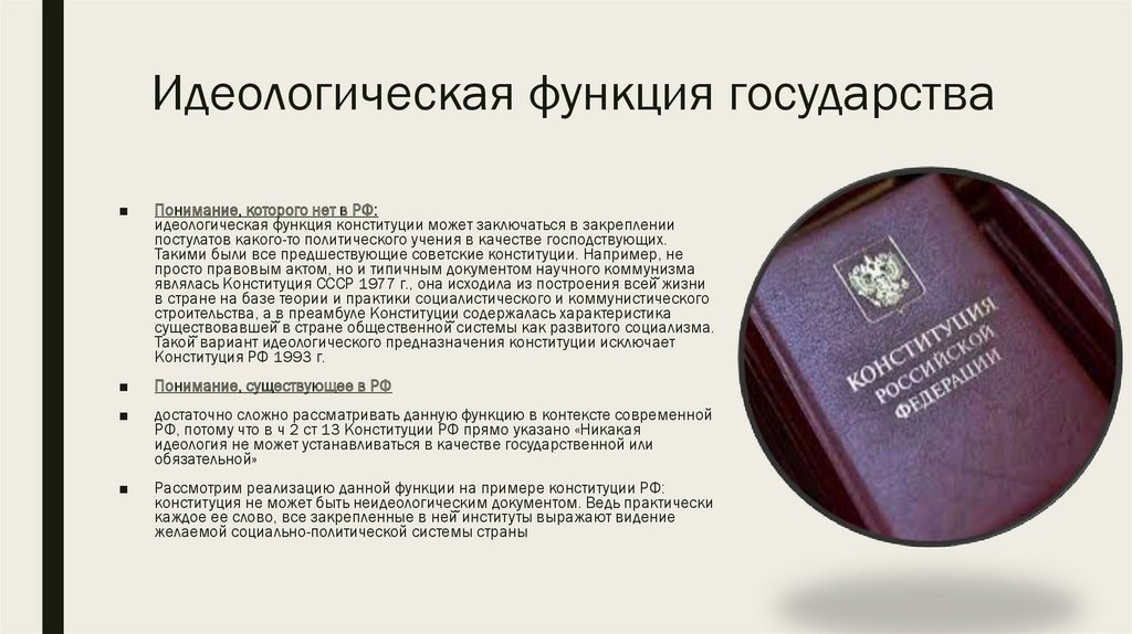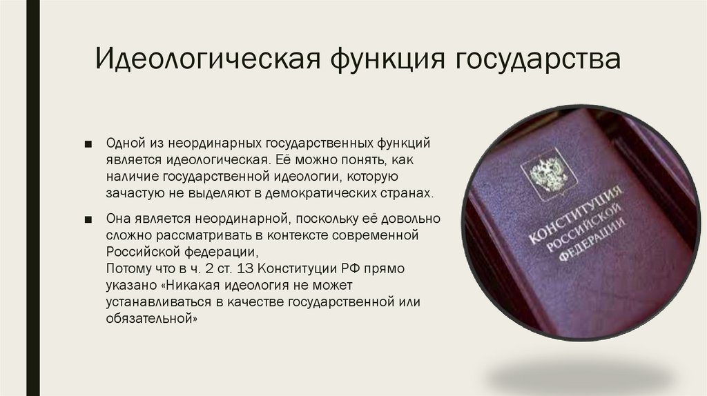 Идеологическая функция государства■ Одной из неординарных государственных функций