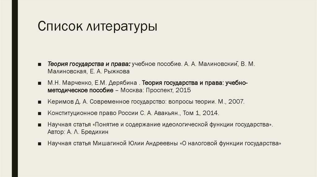 Список литературы■ Теория государства и права: учебное пособие. А. А. Малиновский, В. М.