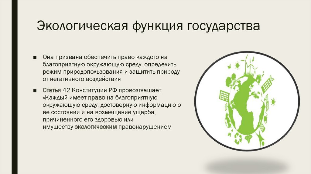 Экологическая функция государства■ Она призвана обеспечить право каждого на
