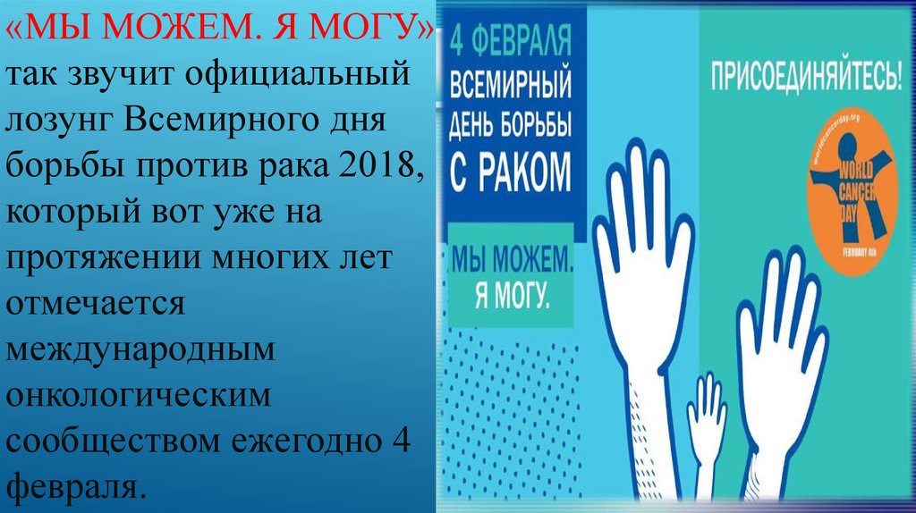 МЫ МОЖЕМ! Я МОГУ! Присоединяйтесь к инициативам Всемирного дня борьбы против рака и создавайте свои инициативы!чение было как можно