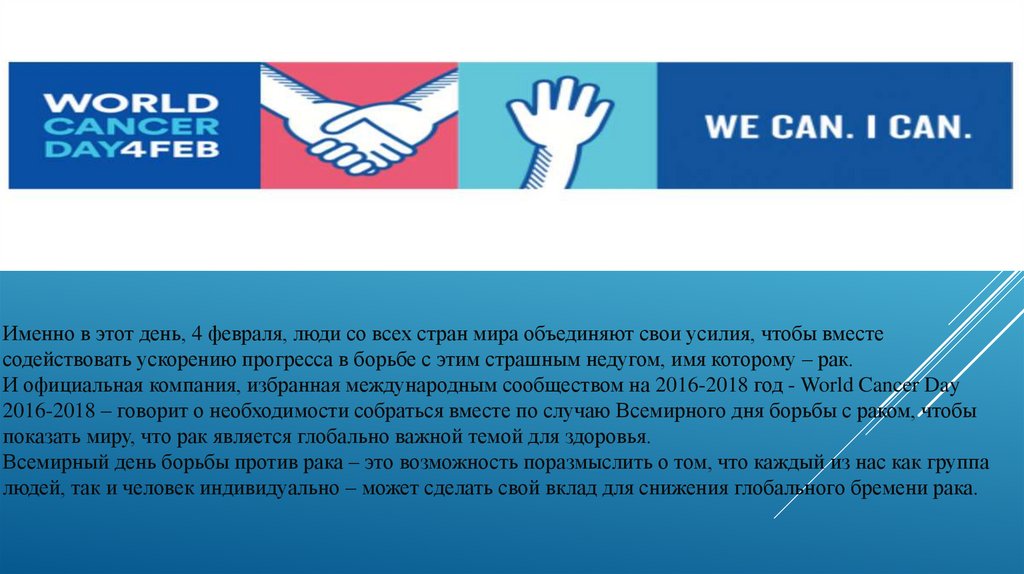2016-2018 – говорит о необходимости собраться вместе по случаю Всемирного дня борьбы с раком, чтобы