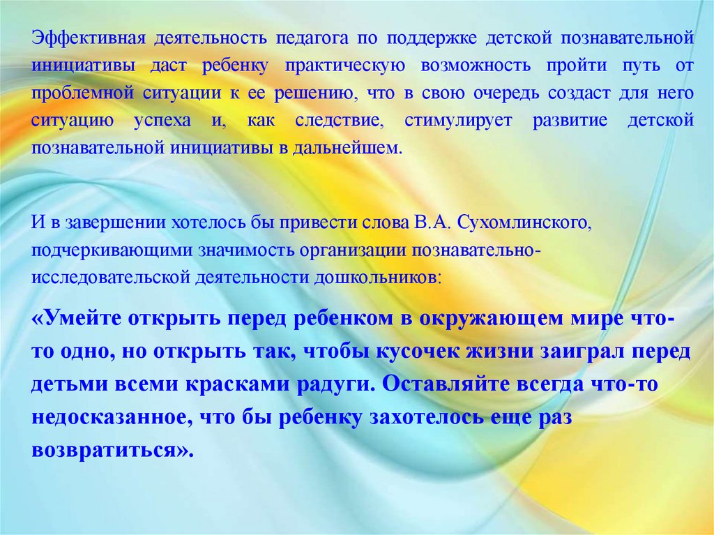 Эффективная деятельность педагога по поддержке детской познавательнойинициативы даст ребенку практическую возможность пройти путь от