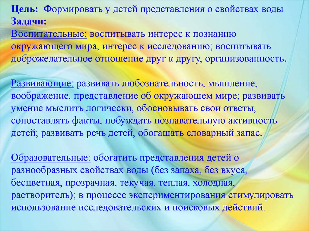 Цель: Формировать у детей представления о свойствах водыЗадачи: