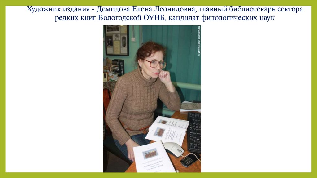 Художник издания - Демидова Елена Леонидовна, главный библиотекарь сектораредких книг Вологодской ОУНБ, кандидат филологических наук