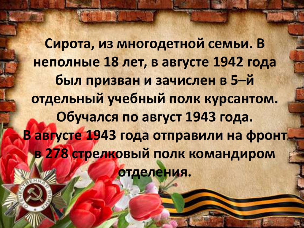 Сирота, из многодетной семьи. Внеполные 18 лет, в августе 1942 года
