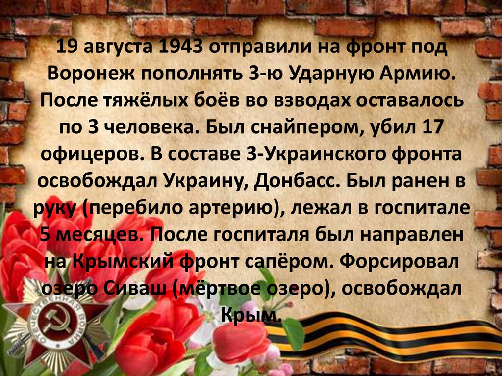 19 августа 1943 отправили на фронт подВоронеж пополнять 3-ю Ударную Армию.