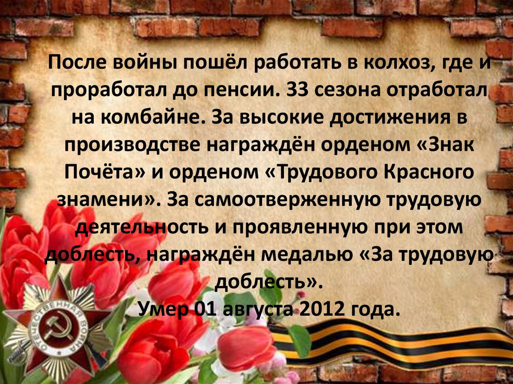 После войны пошёл работать в колхоз, где ипроработал до пенсии. 33 сезона отработал