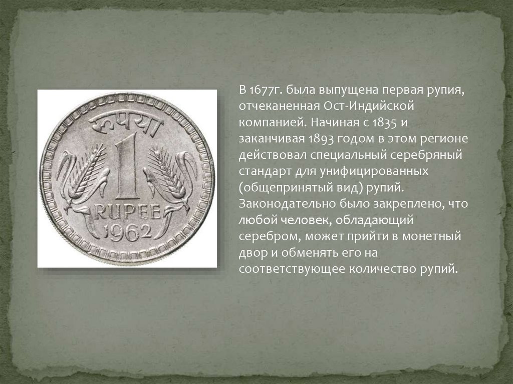 В 1677г. была выпущена первая рупия,отчеканенная Ост-Индийской