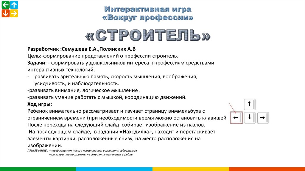 Разработчик :Семушева Е.А.,Полянских А.ВЦель:-формирование представлений о профессии строитель.