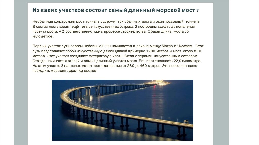 Из каких участков состоит самый длинный морской мост ?Необычная конструкция мост-тоннель содержит три обычных моста и один подводный тоннель.
