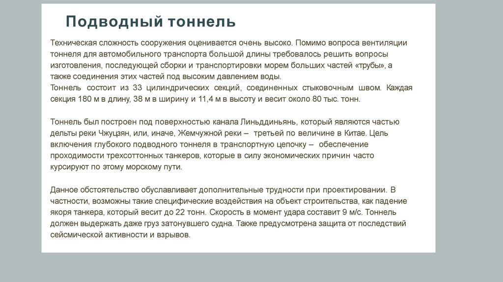 Подводный тоннельТехническая сложность сооружения оценивается очень высоко. Помимо вопроса вентиляции