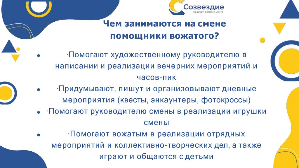Чем занимаются на сменепомощники вожатого?