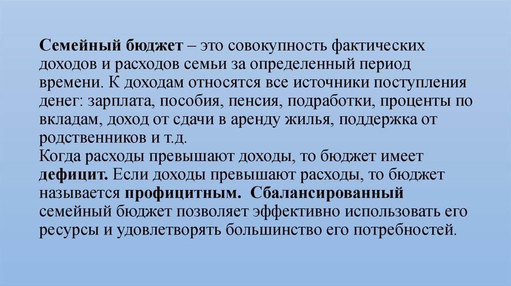 Семейный бюджет – это совокупность фактическихдоходов и расходов семьи за определенный период