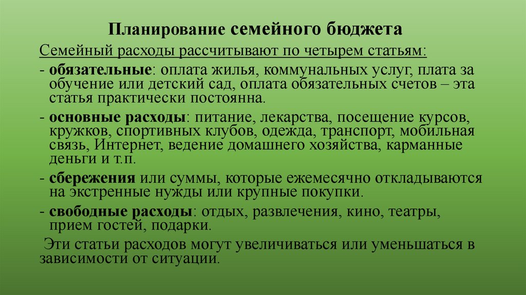 Планирование семейного бюджетаСемейный расходы рассчитывают по четырем статьям: