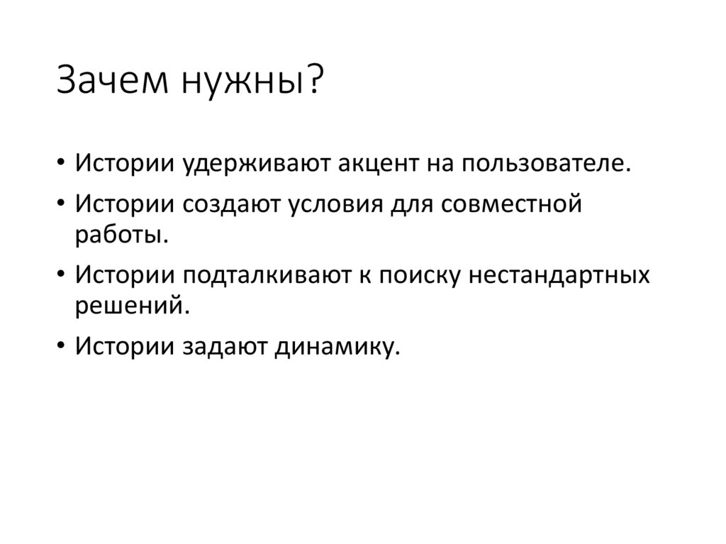 Зачем нужны?• Истории удерживают акцент на пользователе.