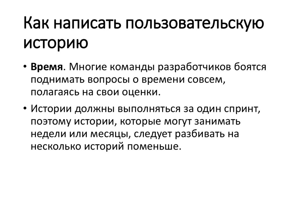 • Истории должны выполняться за один спринт,