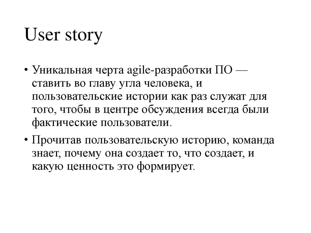 User story• Уникальная черта agile-разработки ПО —