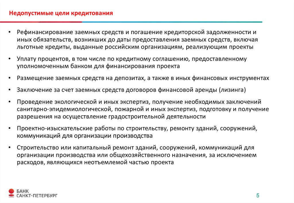 Недопустимые цели кредитования• Рефинансирование заемных средств и погашение кредиторской задолженности и