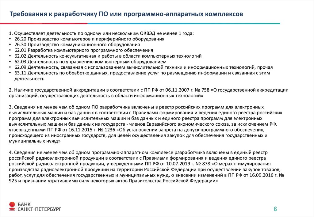 Требования к разработчику ПО или программно-аппаратных комплексов1. Осуществляет деятельность по одному или нескольким ОКВЭД не менее 1 года: