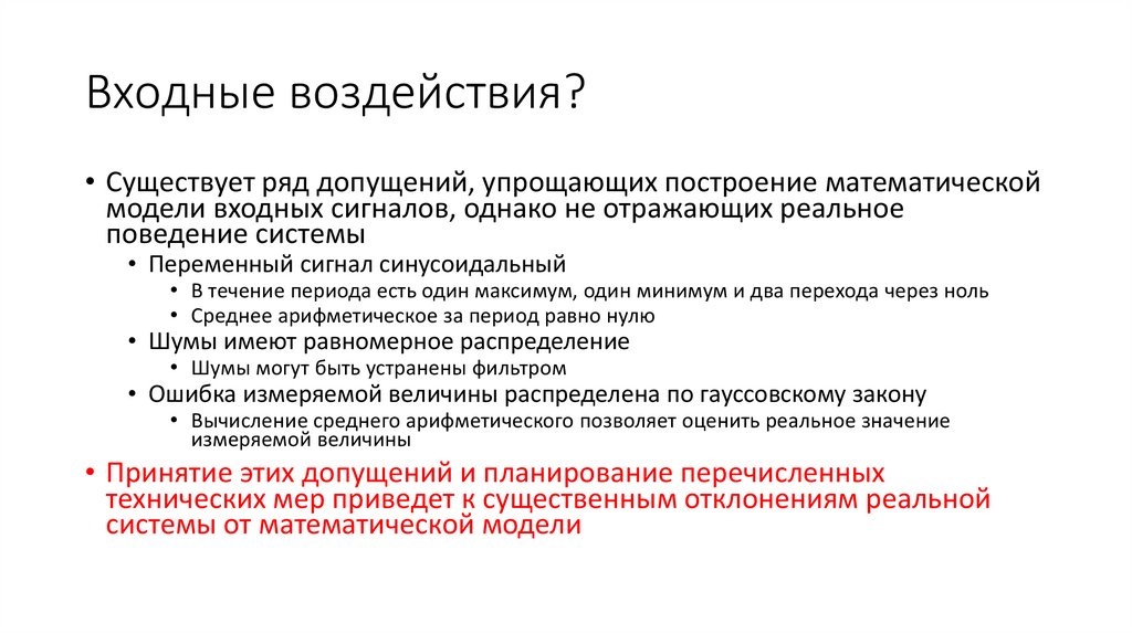 Входные воздействия?• Существует ряд допущений, упрощающих построение математической