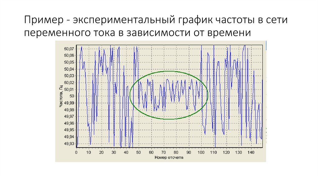 Пример - экспериментальный график частоты в сетипеременного тока в зависимости от времени