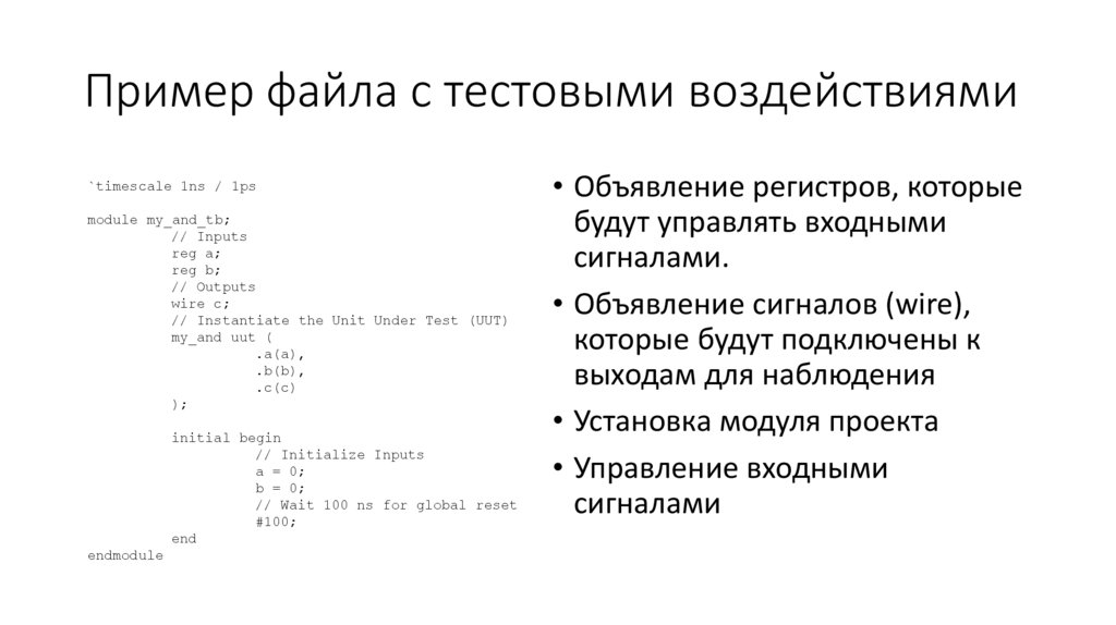 Пример файла с тестовыми воздействиями`timescale 1ns / 1ps