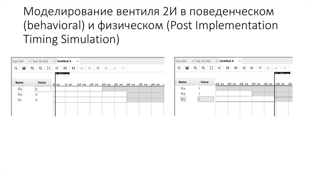 Моделирование вентиля 2И в поведенческом(behavioral) и физическом (Post Implementation