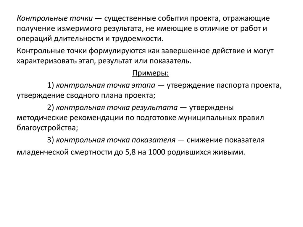 Контрольные точки — существенные события проекта, отражающиеполучение измеримого результата, не имеющие в отличие от работ и