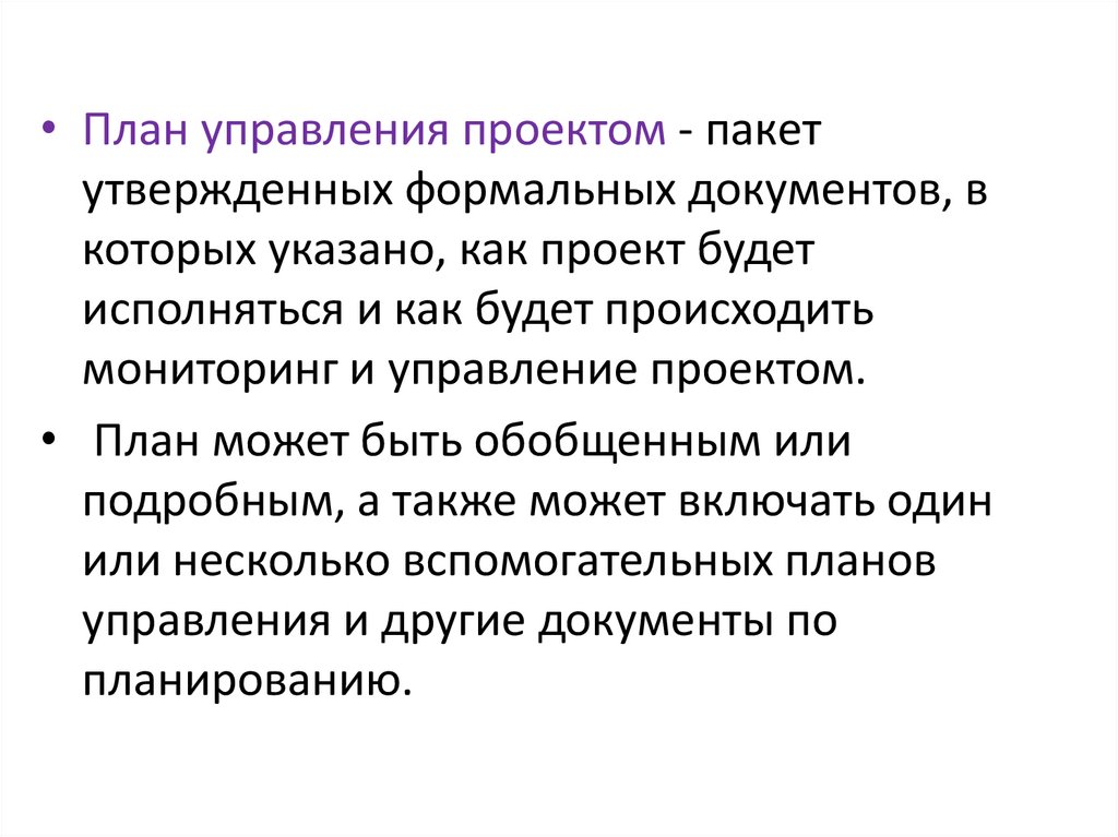 План управления проектом — это сводныйдокумент, который интегрирует все базовые и