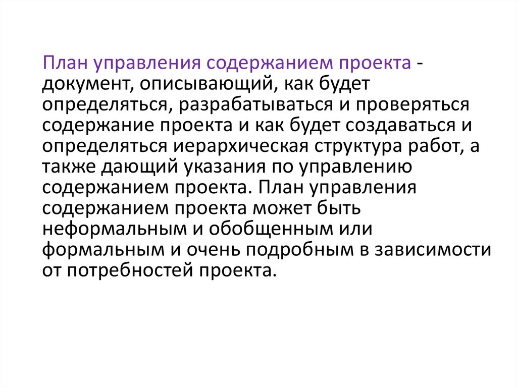 План управления содержанием проекта документ, описывающий, как будетопределяться, разрабатываться и проверяться