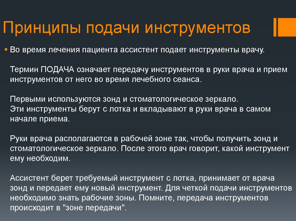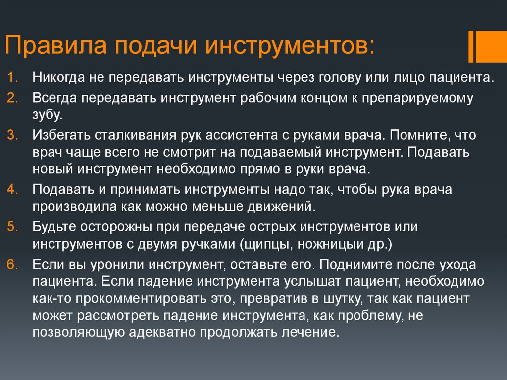 Правила подачи инструментов:1. Никогда не передавать инструменты через голову или лицо пациента.