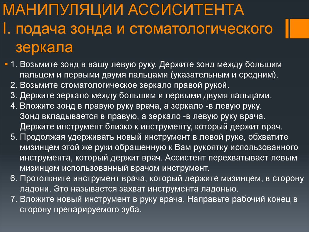 МАНИПУЛЯЦИИ АССИСИТЕНТАI. подача зонда и стоматологического