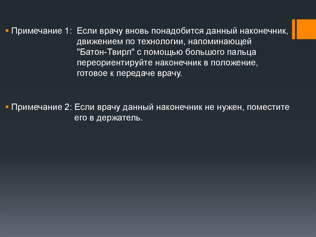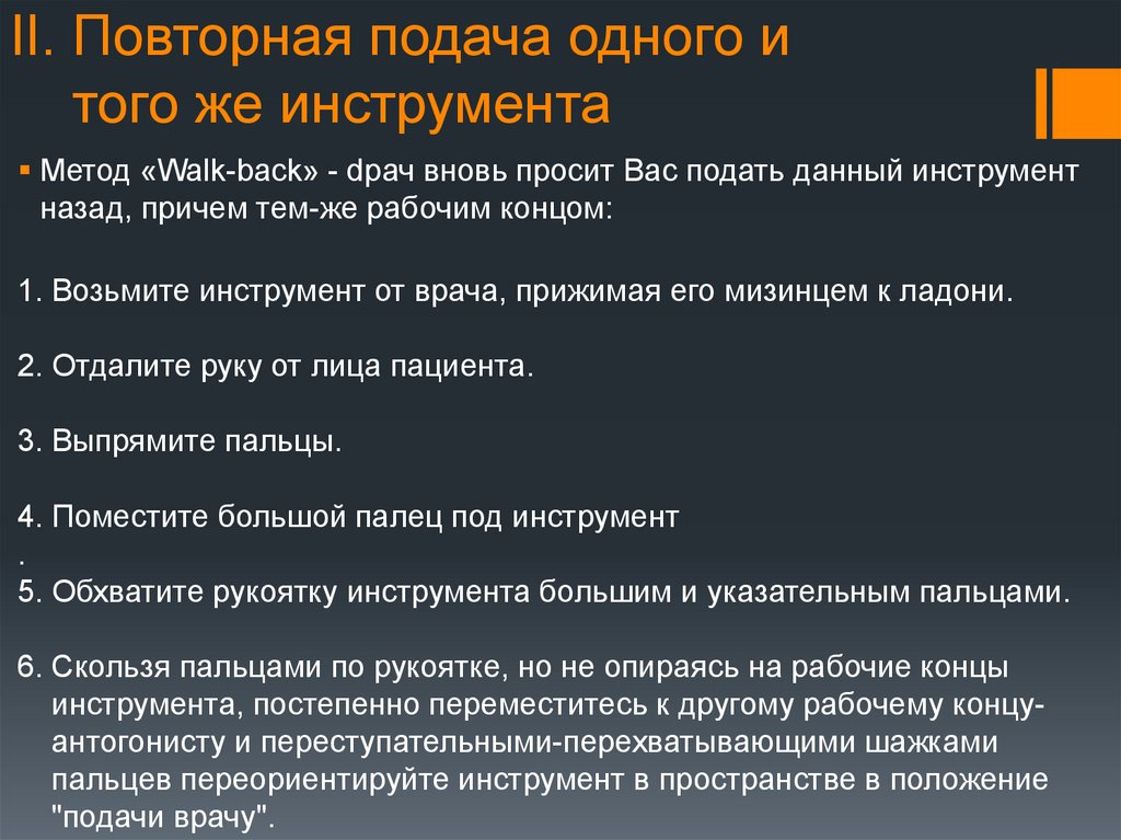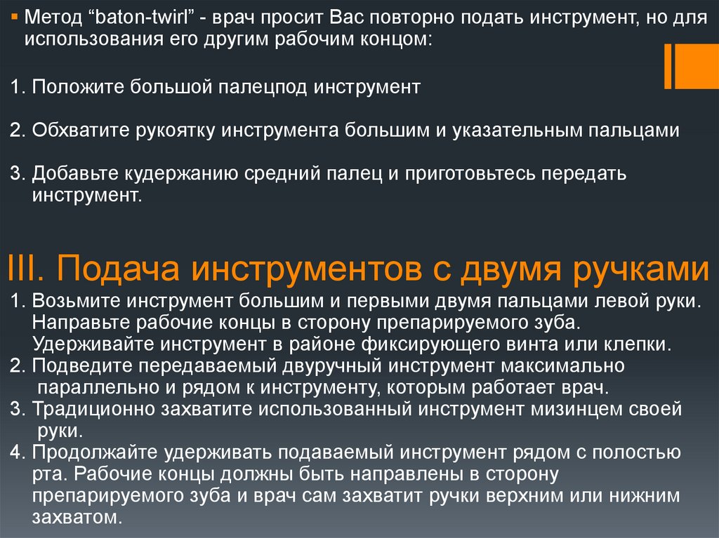 Метод “baton-twirl” - врач просит Вас повторно подать инструмент, но дляиспользования его другим рабочим концом: