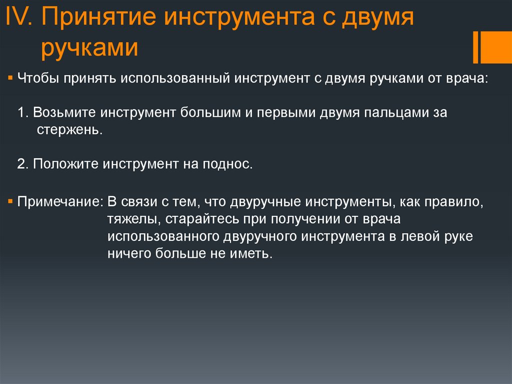 IV. Принятие инструмента с двумяручками