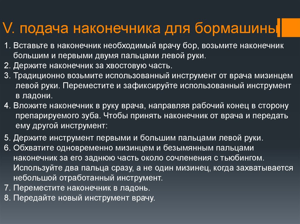препарируемого зуба. Чтобы принять наконечник от врача и передать