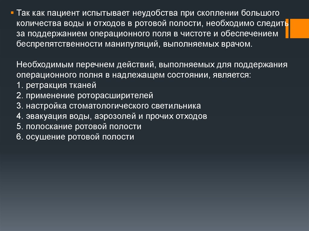 Так как пациент испытывает неудобства при скоплении большогоколичества воды и отходов в ротовой полости, необходимо следить