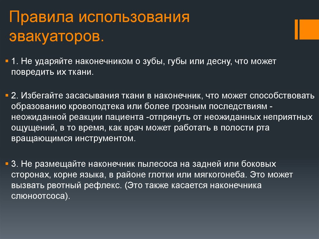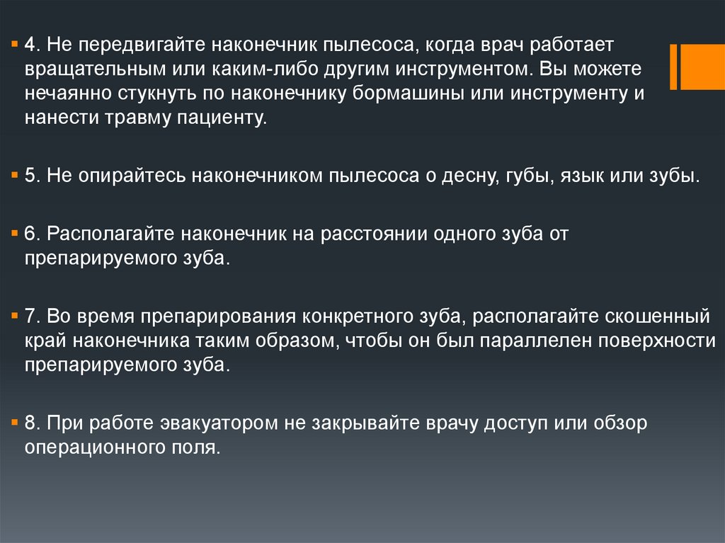 4. Не передвигайте наконечник пылесоса, когда врач работаетвращательным или каким-либо другим инструментом. Вы можете