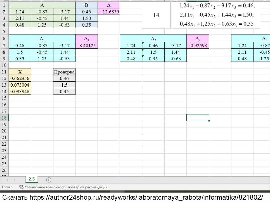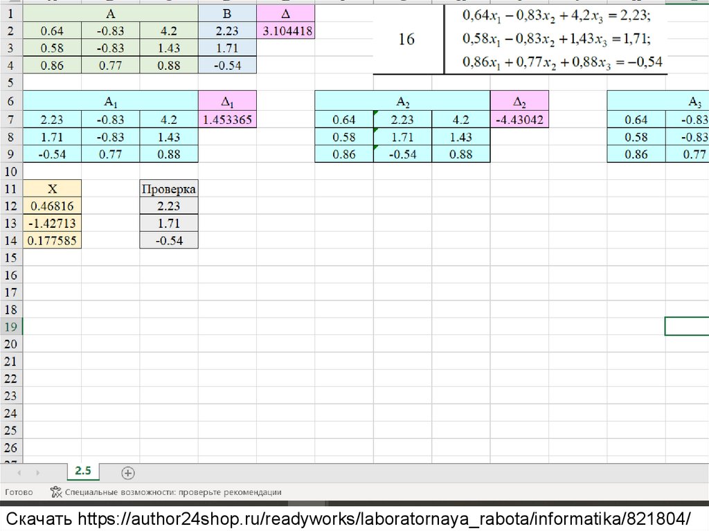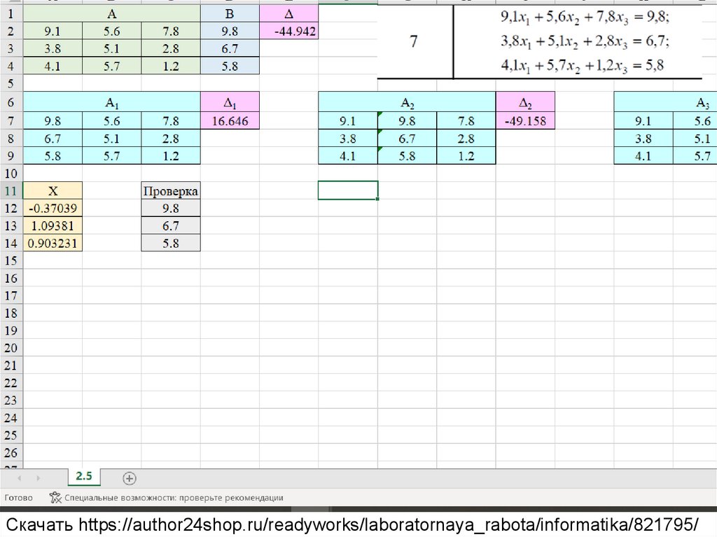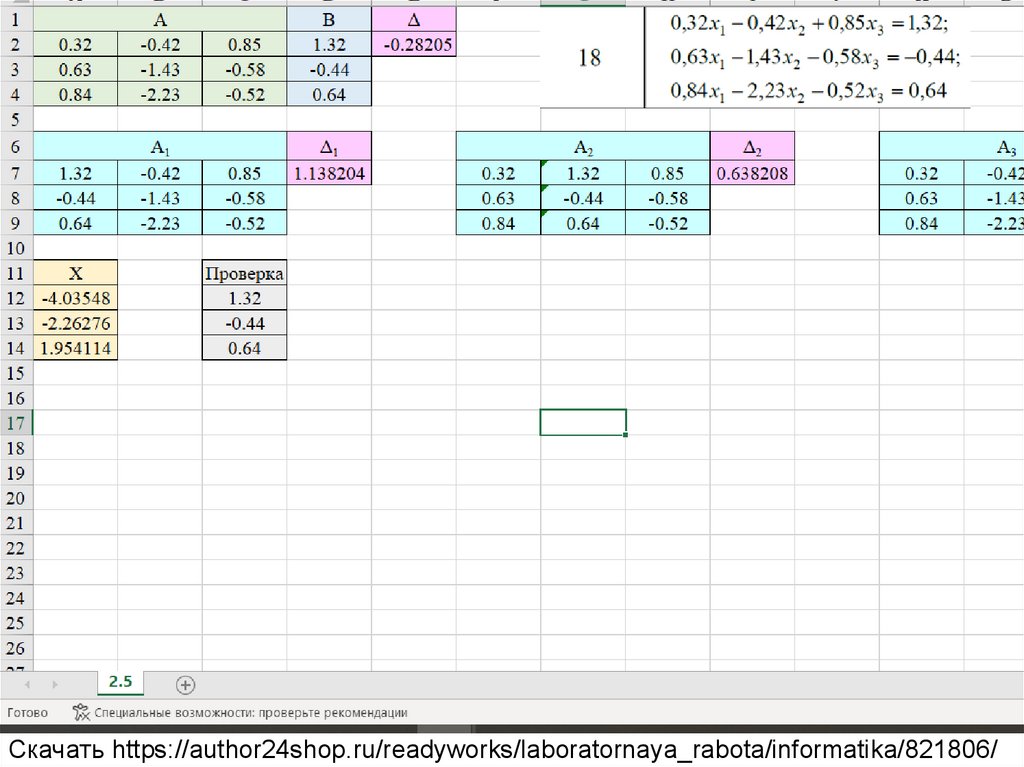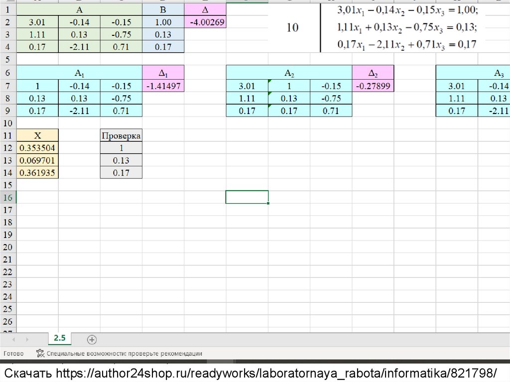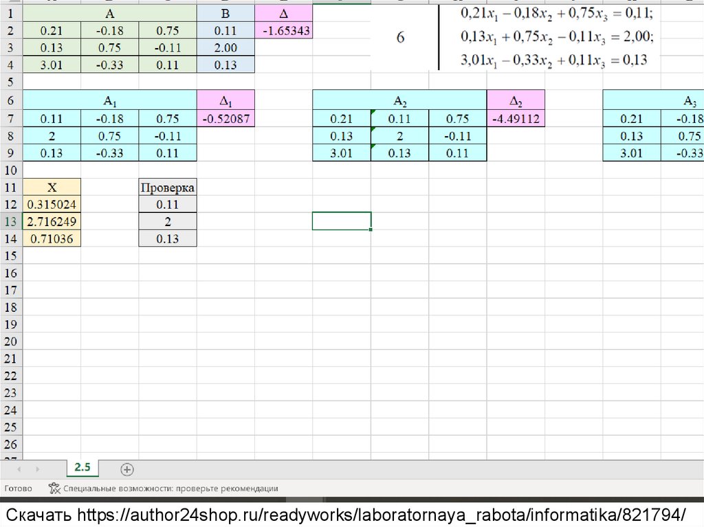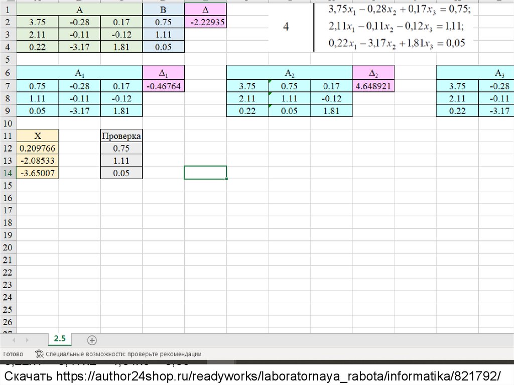 Задание 2.5. Метод КрамераЕсли определитель ∆ матрицы А, составленной из коэффициентов при