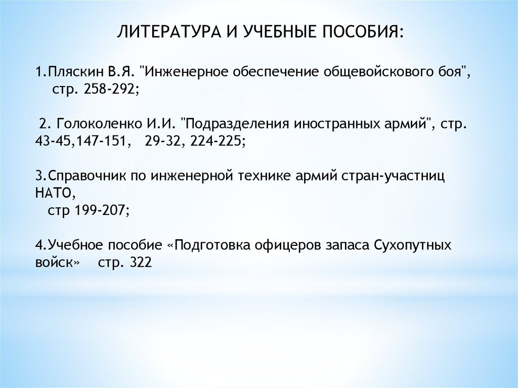 ЛИТЕРАТУРА И УЧЕБНЫЕ ПОСОБИЯ:1.Пляскин В.Я. "Инженерное обеспечение общевойскового боя",