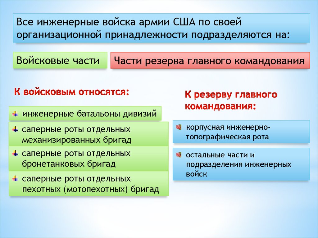 Все инженерные войска армии США по своейорганизационной принадлежности подразделяются на: