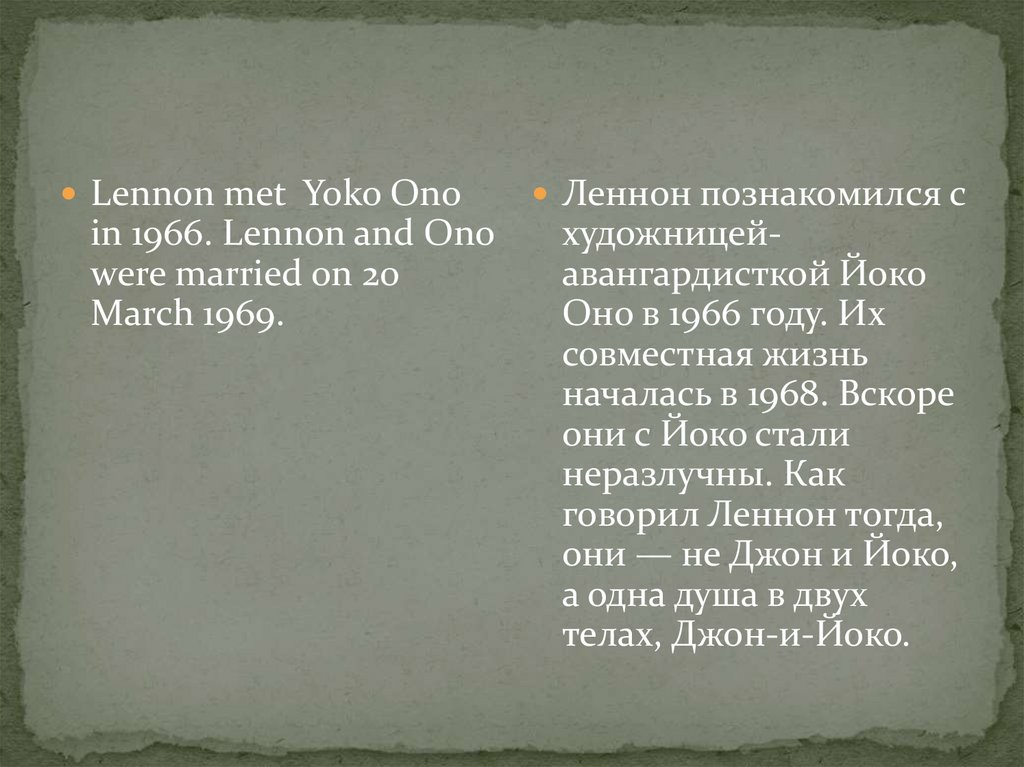 Lennon met Yoko Onoin 1966. Lennon and Ono