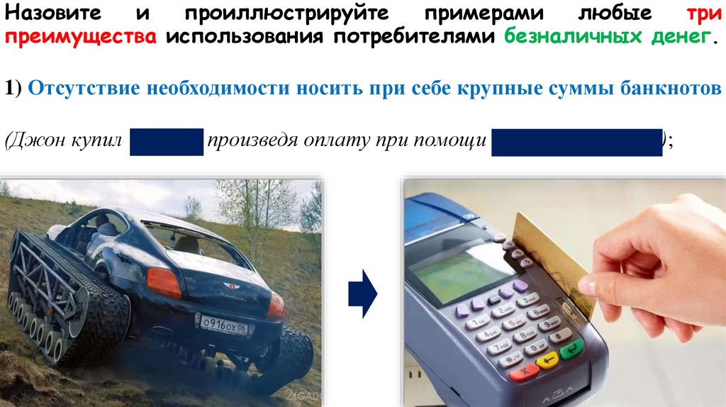 (Джон купил Бентли произведя оплату при помощи банковской карты);