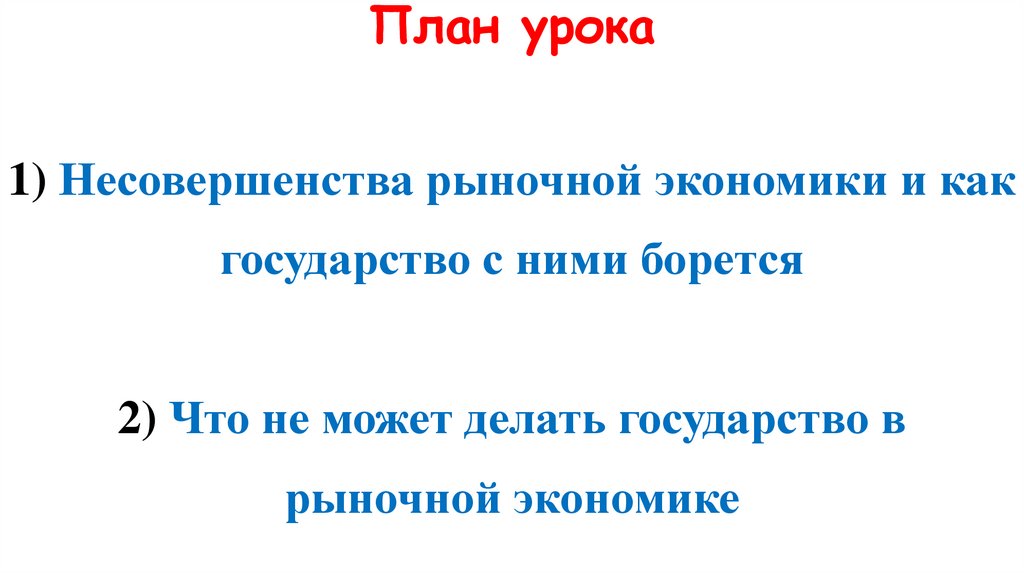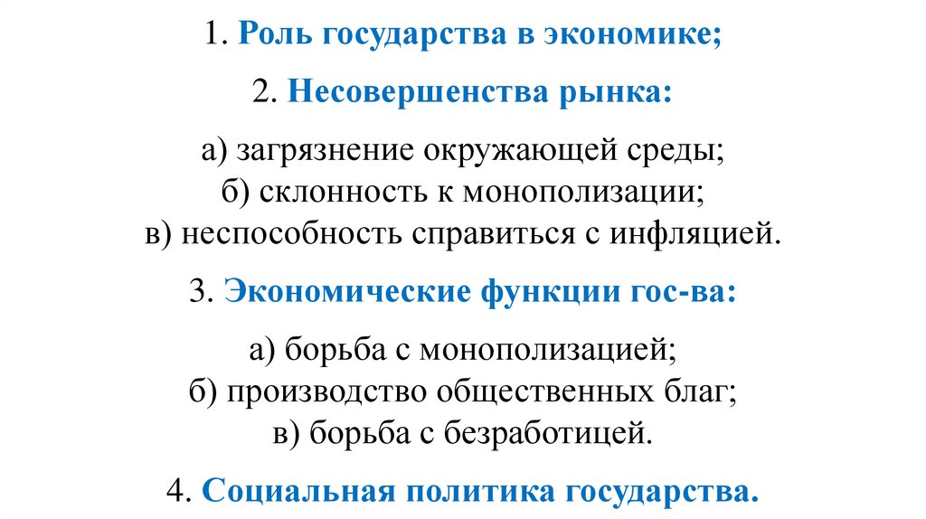 1. Роль государства в экономике;2. Несовершенства рынка: