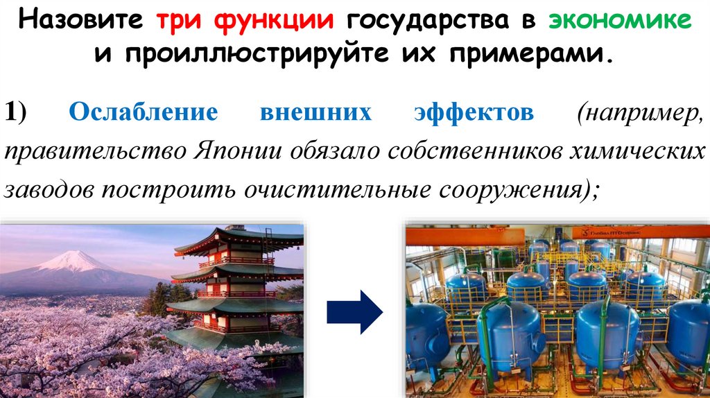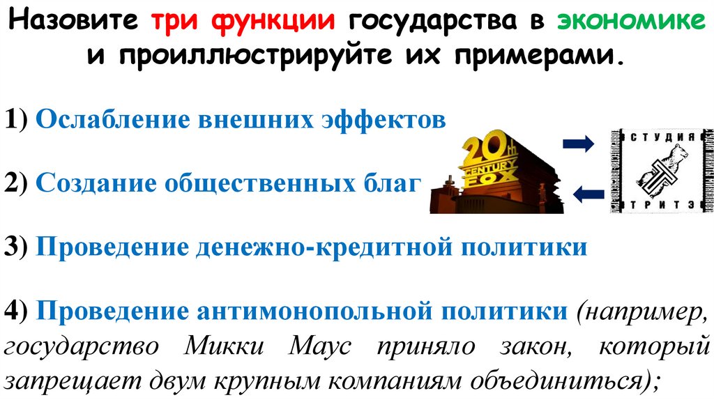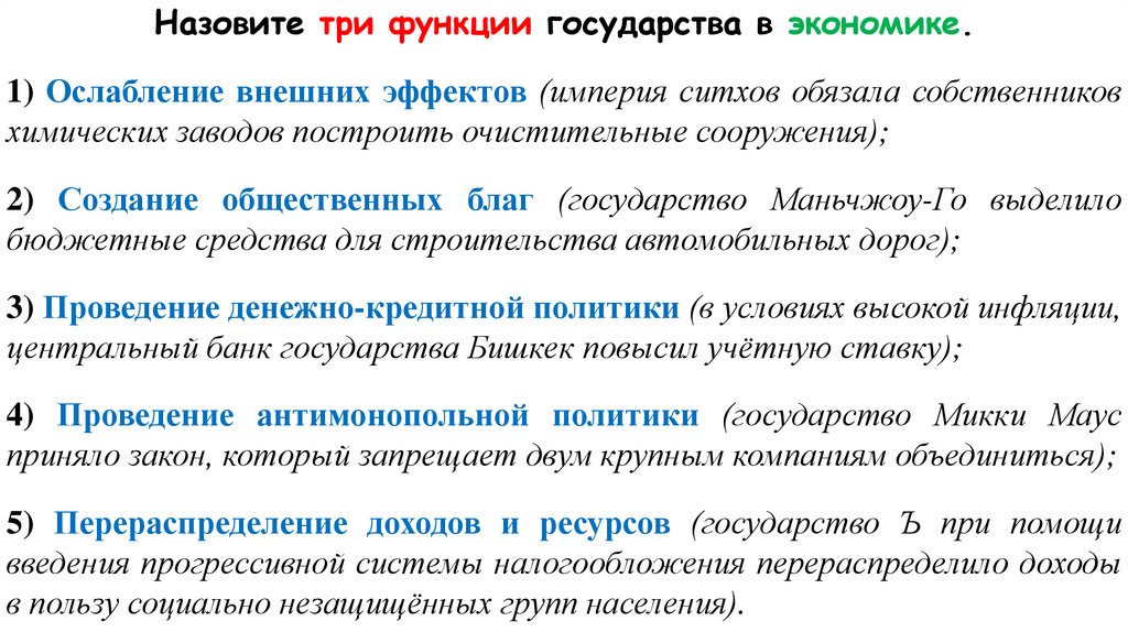 Назовите три функции государства в экономике ипроиллюстрируйте их примерами.